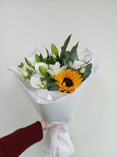 Букет всё что на фото, 5 роз и астры