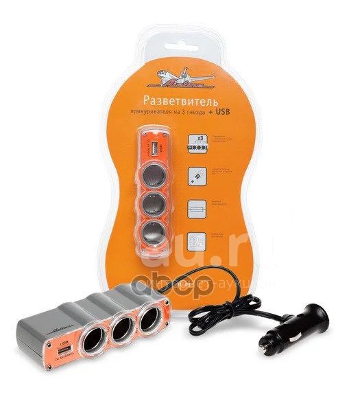 Прикуриватель-разветвитель на 3 гнезда usb (оранжевый) AIRLINE арт. ASP3U03