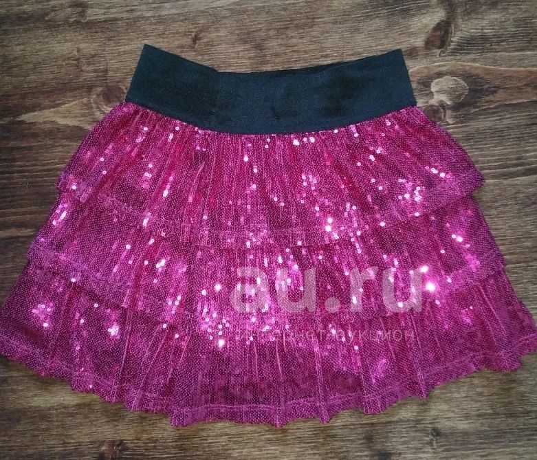 Наша концертная юбка. Носили с черной футболкой. На трикотажном подкладе. На сцене в свете софитов вся сверкает, смотрится очень красиво. Длина 32 см, в талии с нерастянутой резинкой 56 см. Можно носить, чуть приспуская на бедра. На рост 122-134. Ярче, чем на фото и чуть темнее.