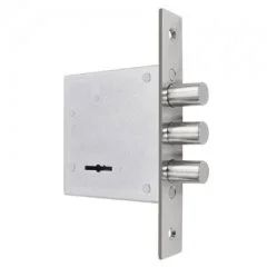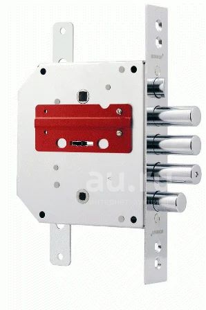 Замок врезной сувальдный с защелкой, задвижкой и тягами. Предназначен для металлических дверей. Засов из трех цилиндрических ригелей диаметром 17,7 мм, с максимальным вылетом 40 мм. Вылет задвижки - 24,5мм. Удаление ключевого отверстия 65,5 мм. Межосевое расстояние до защелки - 42мм, до задвижки - 47мм. Габариты замка - 137х145х30мм. Комплектация - 5 ключей. В одном из ригелей расположен закаленный стальной стержень, обеспечивающий надежную защиту от перепиливания.