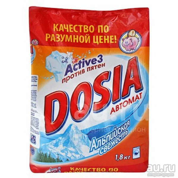 Синтетическое моющее средство Dosia "Альпийская Свежесть" автомат, 1,8кг.Средство моющее синтетическое порошкообразное для автоматических стиральных машин. Не предназначен для стирки изделий из шерсти и шелка. Новая Dosia Active 3 содержит три активных компонента против различных типов пятен, которые: воздействуют на волокна ткани и удаляют общие загрязнения, удаляют сложные пятна, отбеливают и придают кристальную белизну. Следуйте рекомендациям на ярлыках одежды при выборе температуры стирки. Белое белье стирайте отдельно от цветного. Состав: менее 5% кислородосодержащий отбеливатель,цеолиты,поликарбоксилаты,АПАВ,НПАВ,энзимы,оптический отбеливатель,антивспениватель,ароматизаторы. Хранить в сухом месте, недоступном для детей и вдали от пищевыхпродуктов. При попадании в глаза немедленно промыть проточной водой и обратиться к врачу.Срок хранения 2 года.ГОСТ Р 52488-2005