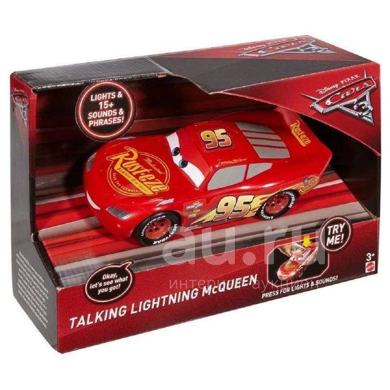 Тачки, Молния Маквин машина, свет/звук от Дисней Пиксар Красная машинка Молния МаКкуин - это точная копия героя из м/ф Тачки, говорит 15 фраз на английском языке, у нее светятся задние и передние фары. У нее нет кнопки - машинка начинает работать от прикосновения рук. Размер машинки:25 см на 11 см