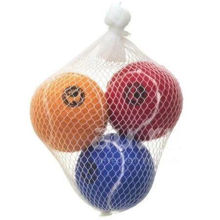 Набор из трех теннисных мячей с пищалками из безопасных материалов. Легко чистятся, не тонут в воде, подходят для активной самостоятельной игры. Неабразивный теннисный фетр, из которого выполнены мячи, мягко очищает зубы.