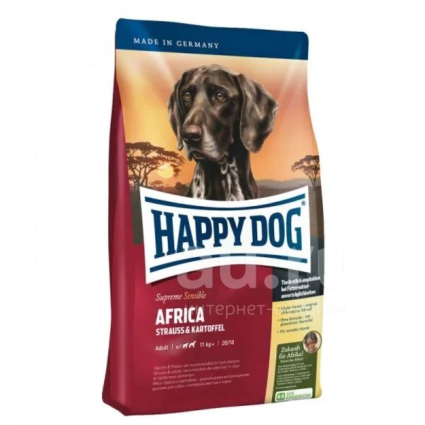 Полнорационный корм для всех взрослых собак весом от 11 кг с нормальной потребностью в энергии. Необыкновенно вкусный полнорационный корм класса супер-премиум Happy Dog Africa идеален для всех требовательных лакомок, которые предпочитают нестандартный корм или очень разборчивы в еде. Он отлично подходит также для собак средних и крупных пород с чувствительным пищеварением, так как учитывает их особые потребности: уникальная формула корма Happy Dog Africa объединяет мясо страуса и картофель. Мясо страуса является источником очень редкого белка и идеально подходит для собак, страдающих пищевой непереносимостью. Картофель не содержит глютена и рекомендован для собак, не переносящих злаки. Эксклюзивную рецептуру дополняют ценные Омега-3 и Омега-6 жирные кислоты, которые гарантируют собаке здоровую кожу и блестящую шерсть. Специальная форма крокет соответствует форме челюстей всех собак средних и крупных пород. Без злаков. С картофелем, не содержащим глютена. Подходит для чувствительных собак. Рекомендован ветеринарными врачами для собак с непереносимостью к злакам и различным источникам белка.