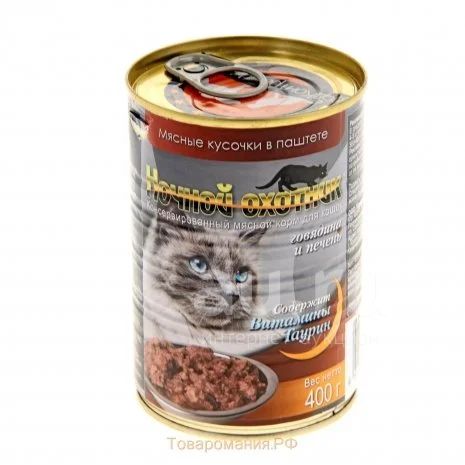 Консервы для взрослых кошек "Ночной охотник" с говядиной и печенью - полноценное сбалансированное питание для взрослых кошек. Корм изготовлен из натурального мяса, без содержания сои, консервантов и ГМО продуктов.