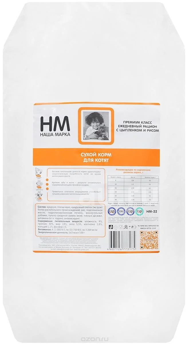 Бренд Наша Марка принадлежит ЗАО "Гатчинский ККЗ" - это крупный сельскохозяйственный холдинг, в состав которого входит завод по производству комбикормов для с/х животных, завод по производству сухих кормов для мелких непродуктивных животных, кормов для рыб промышленного разведения, собственная птицефабрика мясного и яичного направления, завод по производству консервированных кормов для кошек и собак, ферма по выращиванию товарной форели.