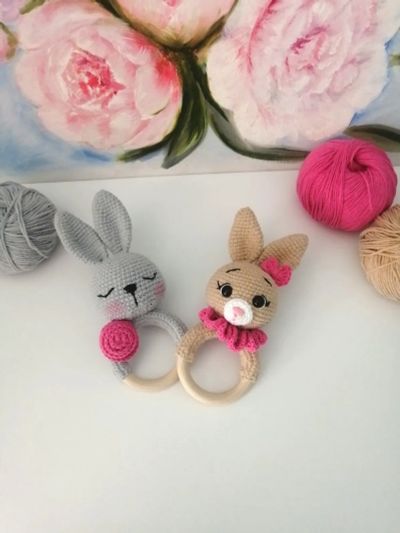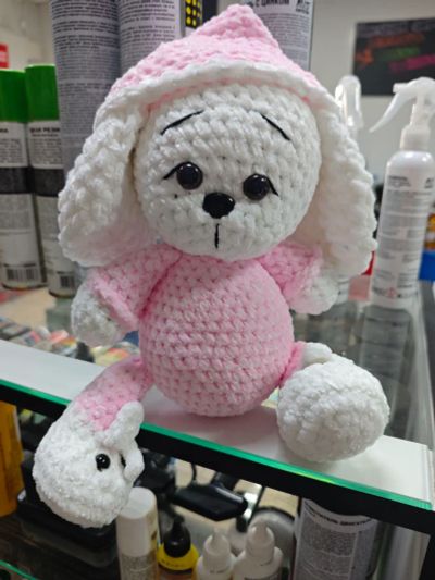 Вязанный мишутка-погремушка темно-розовый,ручная работа