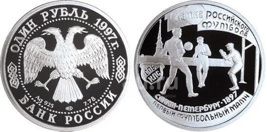 1 рубль 1997 года 100-летие Российского футбола. Первый футбольный матч Серебро Пруф