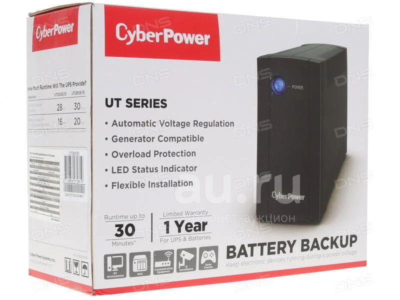 Модель имеет 4 компьютерных разъема питания и может функционировать до 1 мин при 270Вт. ИБП CyberPower UTC650EI защищен от перегрузки, высоковольтных импульсов и всплесков напряжения. Время полной зарядки модели составляет 8 ч.