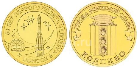 10 + 10 рублей. 50 лет первого полета в космос (2011г), Колпино (2014г), (обмен)
