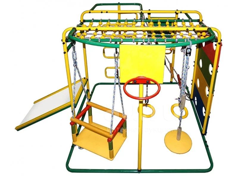 - Комплекс обладает металлическим каркасом. Он укомплектован тарзанкой, веревочной лестницей, качелями, сеткой для лазания, панелью с отверстиями, горкой, баскетбольным кольцом, мольбертом со счетами и гимнастическими кольцами.