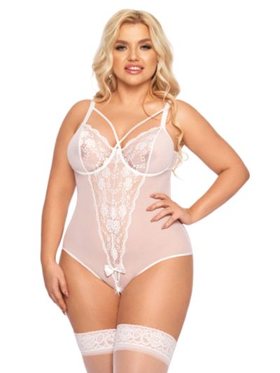 Боди, выполненное из мягкой сетки и кружева, с застежкой на спине. Украшение на груди. Бретели с оригинальным оформлением на спине.