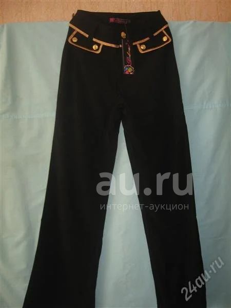 Брюки на широком поясе. На линии пояса сделаны карманчики-обманчики по краю отделанные золотой атласной тканью. Пояс так же отделан золотой тканью. Сзади два накладных кармашка, на одном из них аппликация в виде короны из золотых страз. Состав ткани: 100% полиэстер