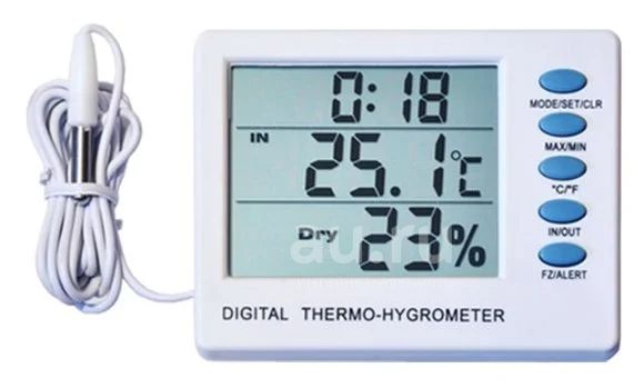 Цифровой электронный термометр для измерения температуры воздуха в комнате или на улице и относительной влажности в комнате с часами-будильником.