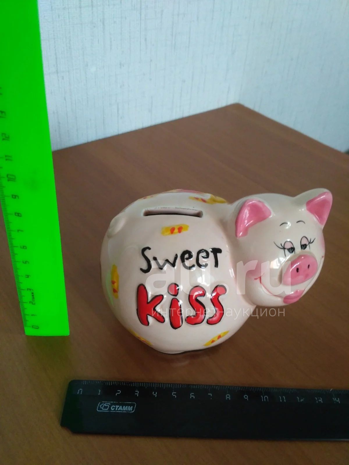 Копилка Свинка розовая с надписью "Sweet kiss" многоразовая. Внизу круглое отверстие, закрывается пластиковой крышкой.