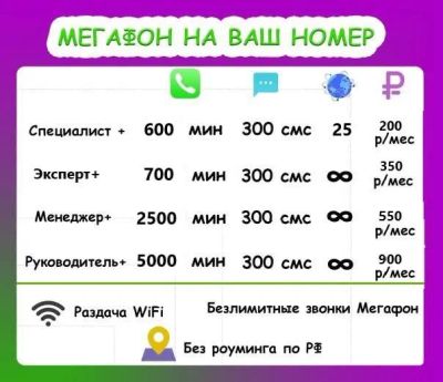 7 999 руб.Мегафон тариф на ваш номер 2000 минут , 80 гб , соц сети безлимит интернет , тарифы на ваш номер с сохранением номера