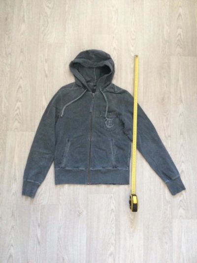 Цвет темно-серый, тонкий трикотаж, состав ткани 95% cotton, 5% lycra. Замеры: длина по спинке 85см, ширина под проймой 76см, длина плеча 22см, длина рукава 70см