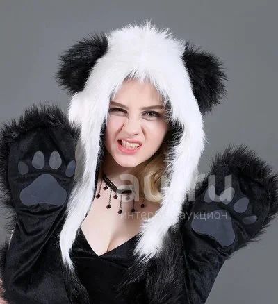Шапка-панда с капюшоном из искусственного меха, черно-белая. Девушке для эффектной фотосессии или ребенку на праздник