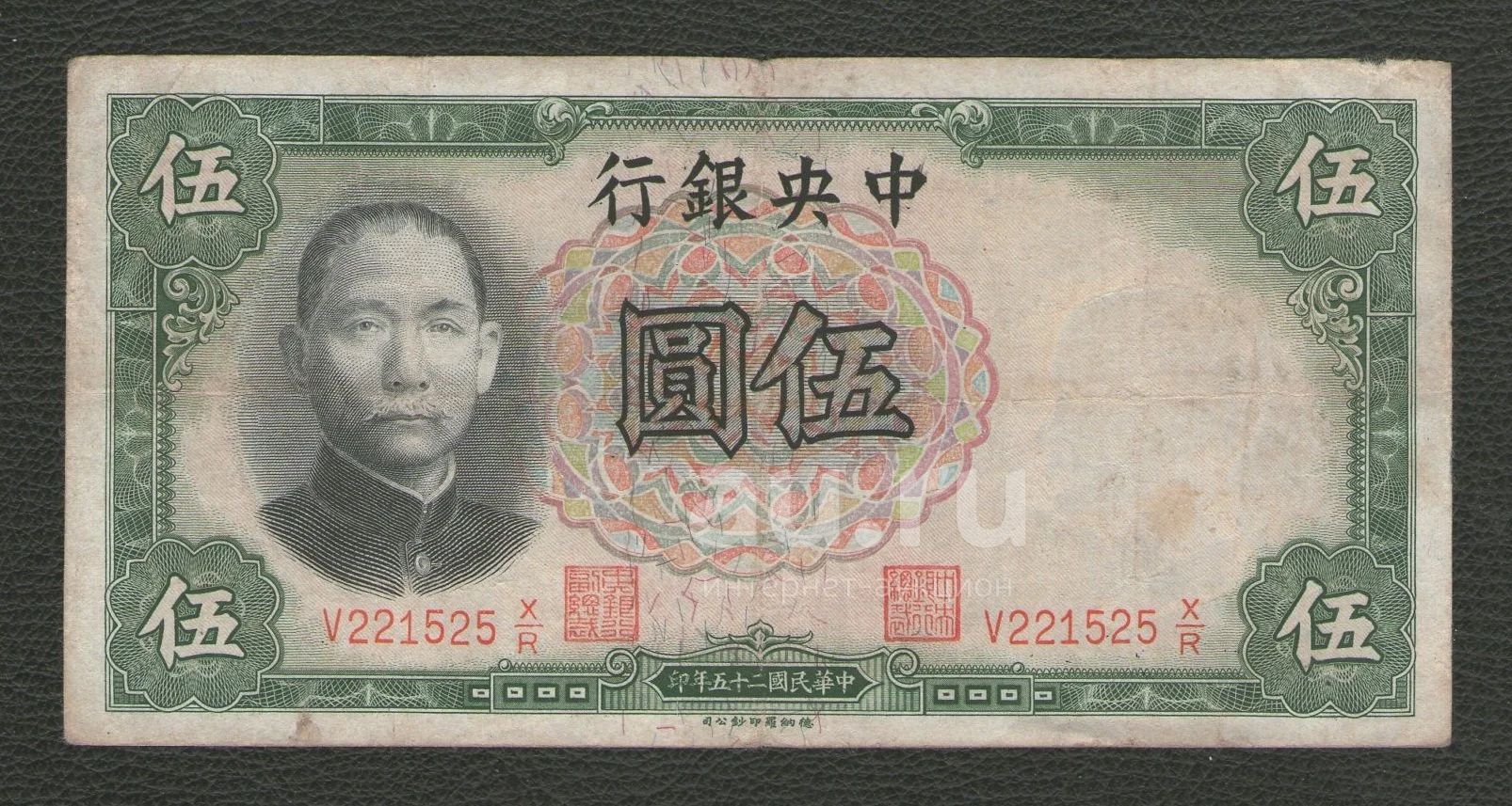 5 юаней 1936 года. Центральный Банк Китая. Хорошая. В коллекцию