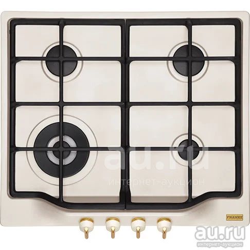 Варочная панель кремового цвета с элегантными белыми ручками, декорированными золотистыми элементами, привлекательно смотрится в большинстве современных и классических кухонных интерьеров.