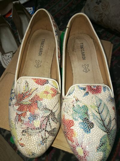 Абсолютно новые балетки, заказывала, не подошли по размеру. Указан как 35, но подойдет на 35,5 - 36 р-р (примерно на стопу 22,5-23). Материал плотный (не хлипкий), но при этом мягкий, подошва резиновая, на заднике вставка из кож.зама. Очень легкие.