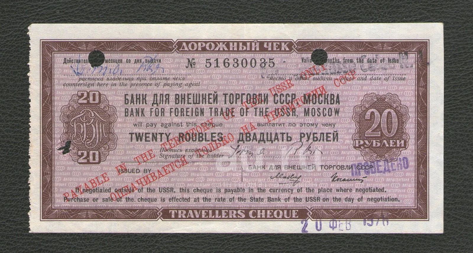 20 рублей 1976 года. Дорожный чек Банка для внешней торговли СССР (Внешторгбанк, ВТБ). Состояние! Рекомендую в коллекцию!