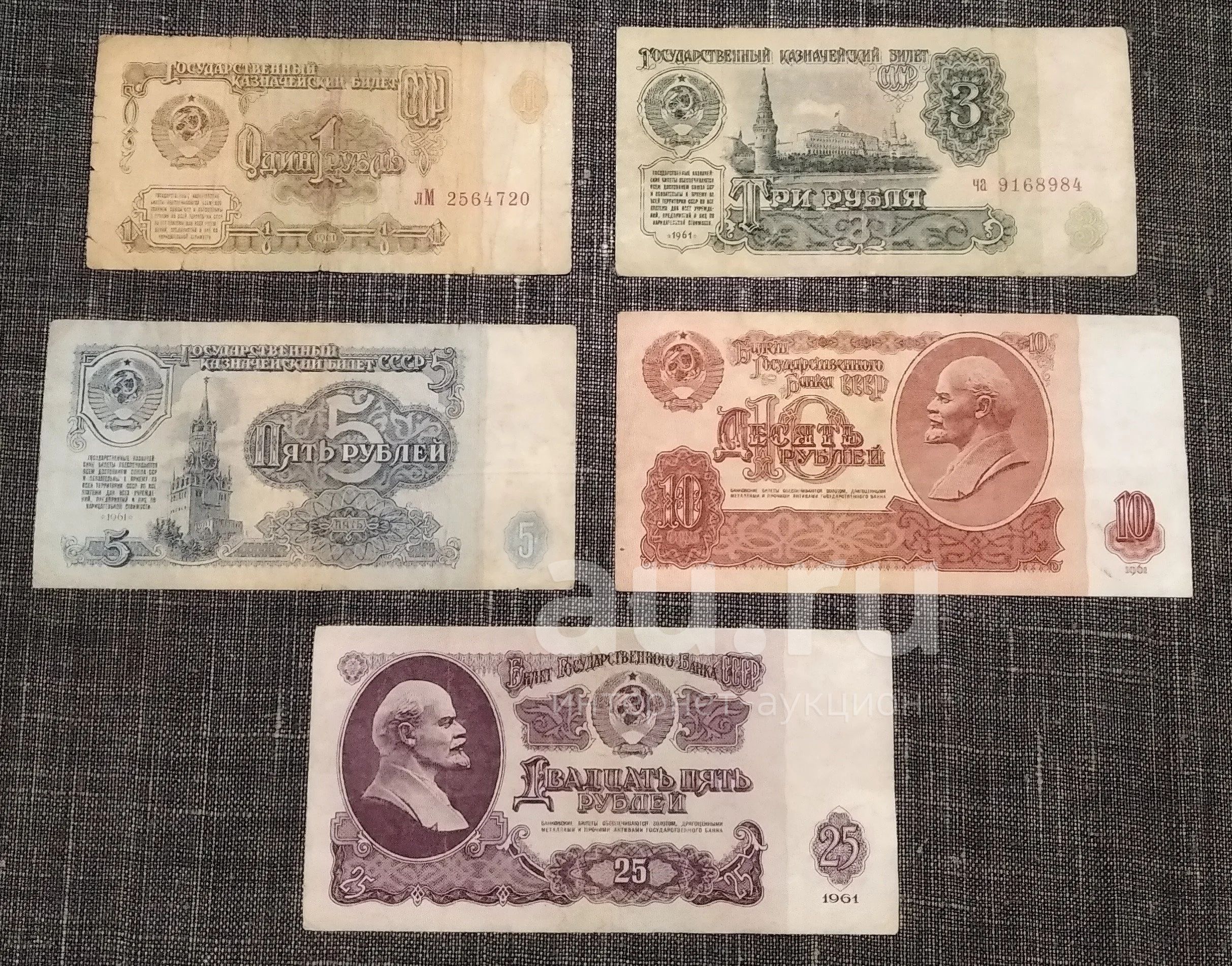 Лот банкнот 1-3-5-10-25 рублей 1961 года (Шрифт 1-го типа). Из обращения. Очень приличные. Нечастые. Рекомендую в коллекцию!