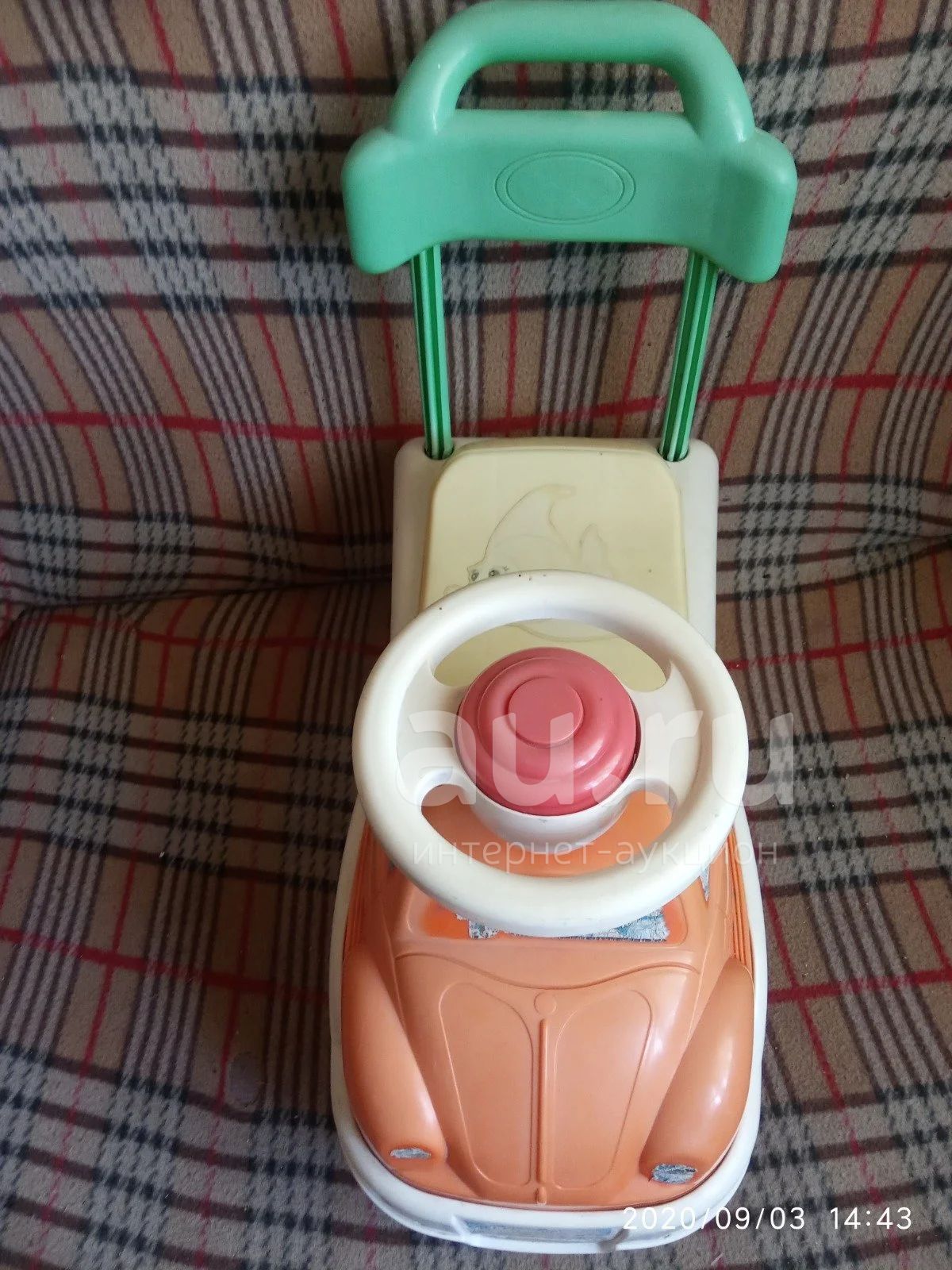 Хорошее состояние.из минусов-стерлись наклейки.машина интересна на первые шаги ребенка.и кататься можно,и возить,держась за ручку,плюс открывается сидение-багажник.можно что-то внутрь положить.на руле нажимается сигнал.длина 51см ширина20см высота 45см