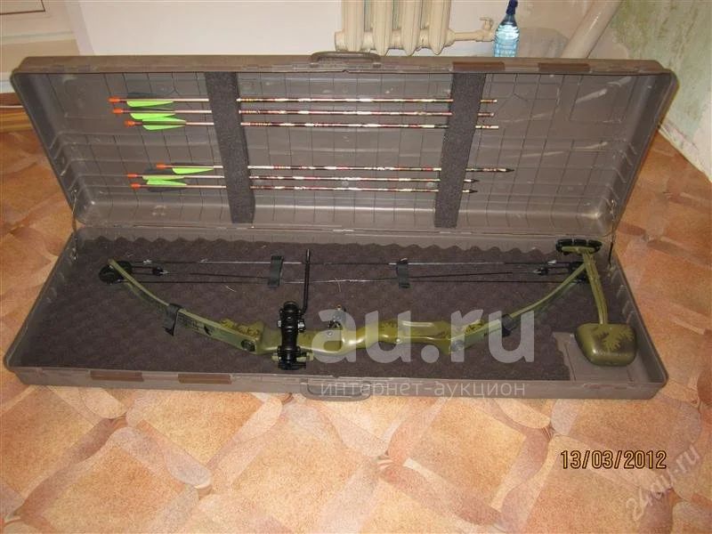Лук охотничий блочный Bear Whitetail II. Имеются навесные аксессуары: полочка Cobra, прицел каллиматорный Pollington 30mm - точка наведения красная, имеет 11 степеней яркости подсветки, что позволяет пользоваться в вечернее и ночное время. В комплекте 6 стрел (карбон),кивер пластиковый, кейс пластиковый. Натяжение приличное, убойная сила-наповал.