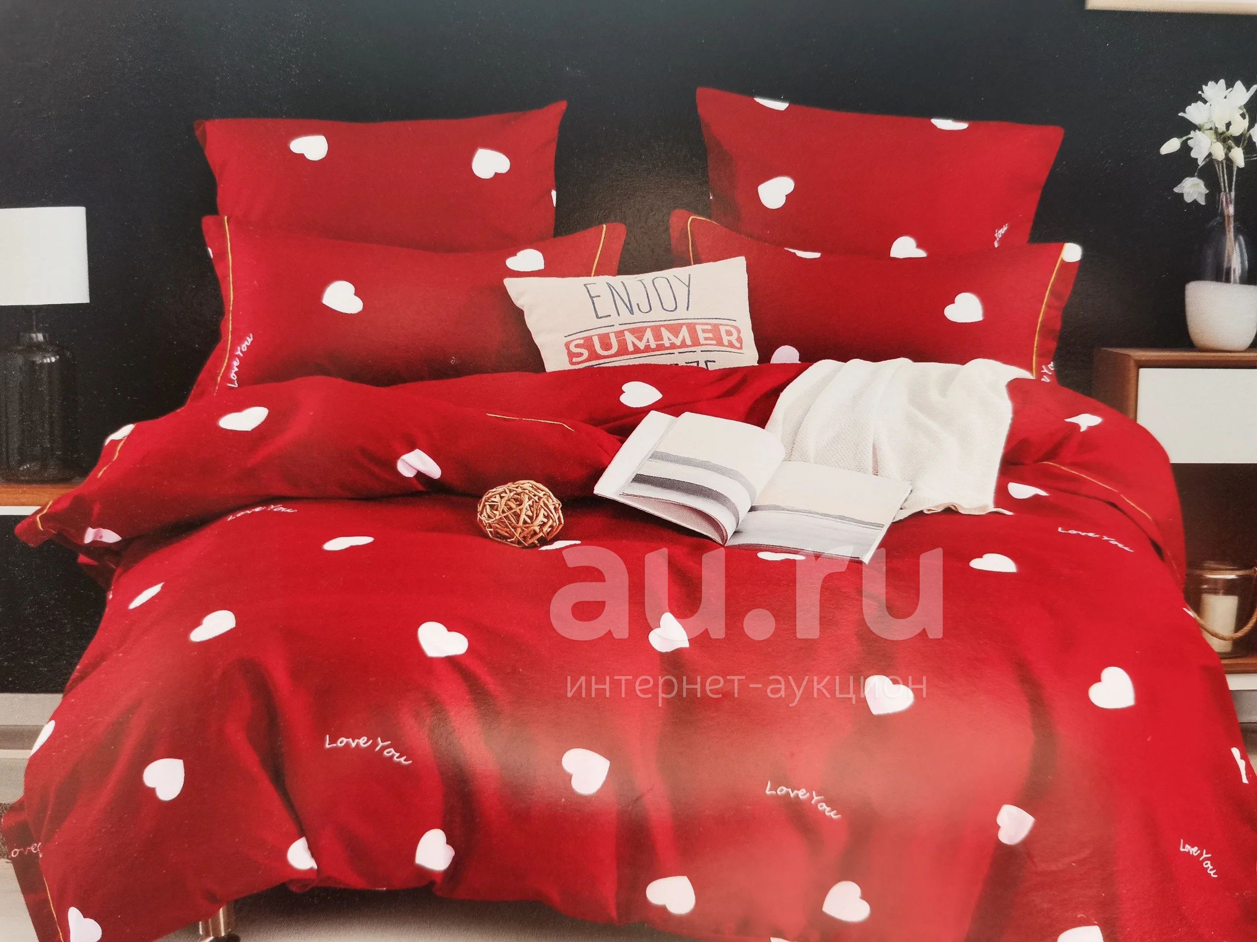 Комплект состоит из простыни 200*220, светлой, пододеяльник (180*220) и наволочки (70*70) красного цвета с сердцами.