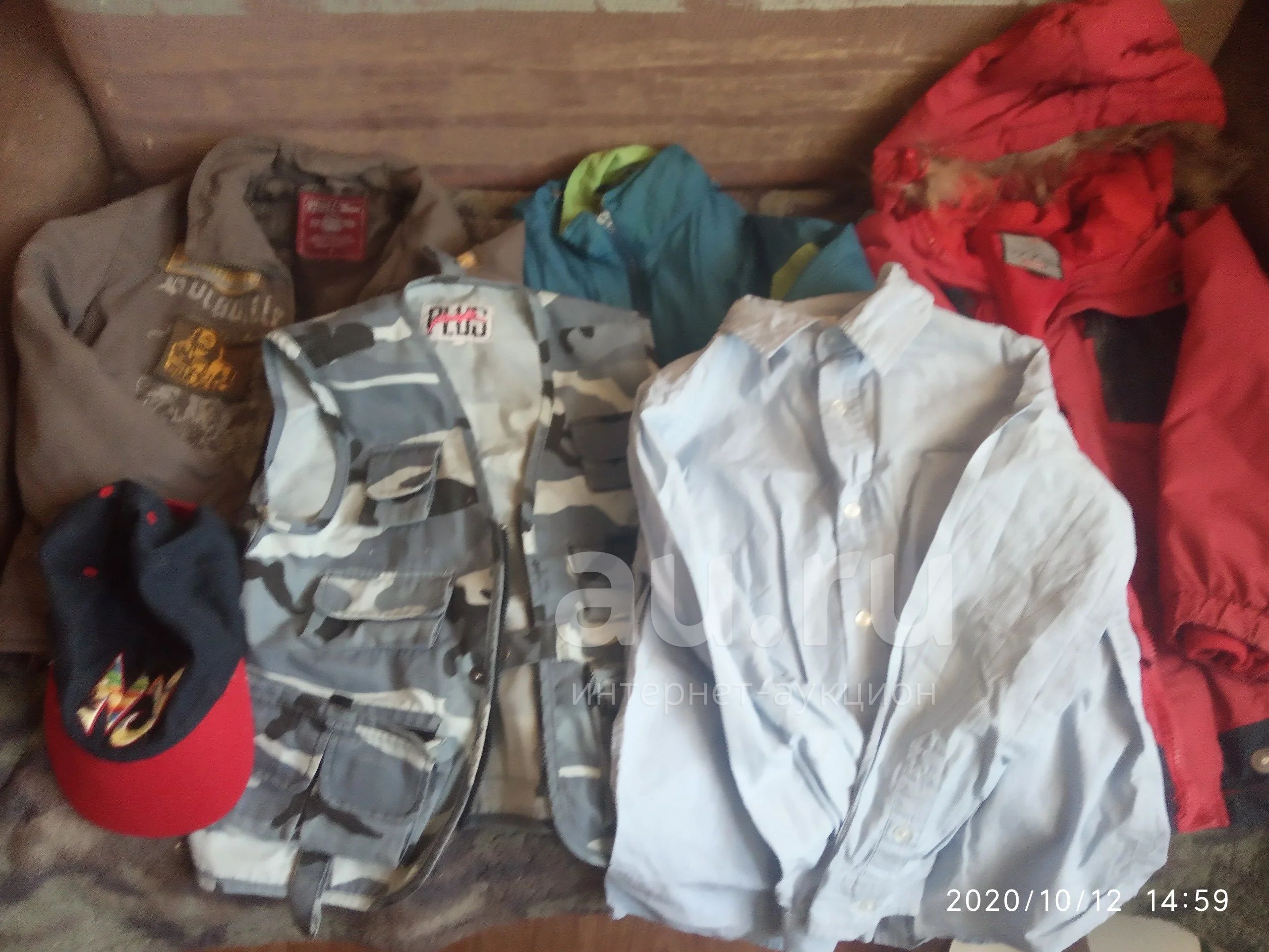 В целом,хорошее состояние,но на всех куртках и жилетке надо поставить собачку.молнии целые.6вещей-3 куртки,жилетка,рубашка,бейсболка.вещи продаются одним лотом