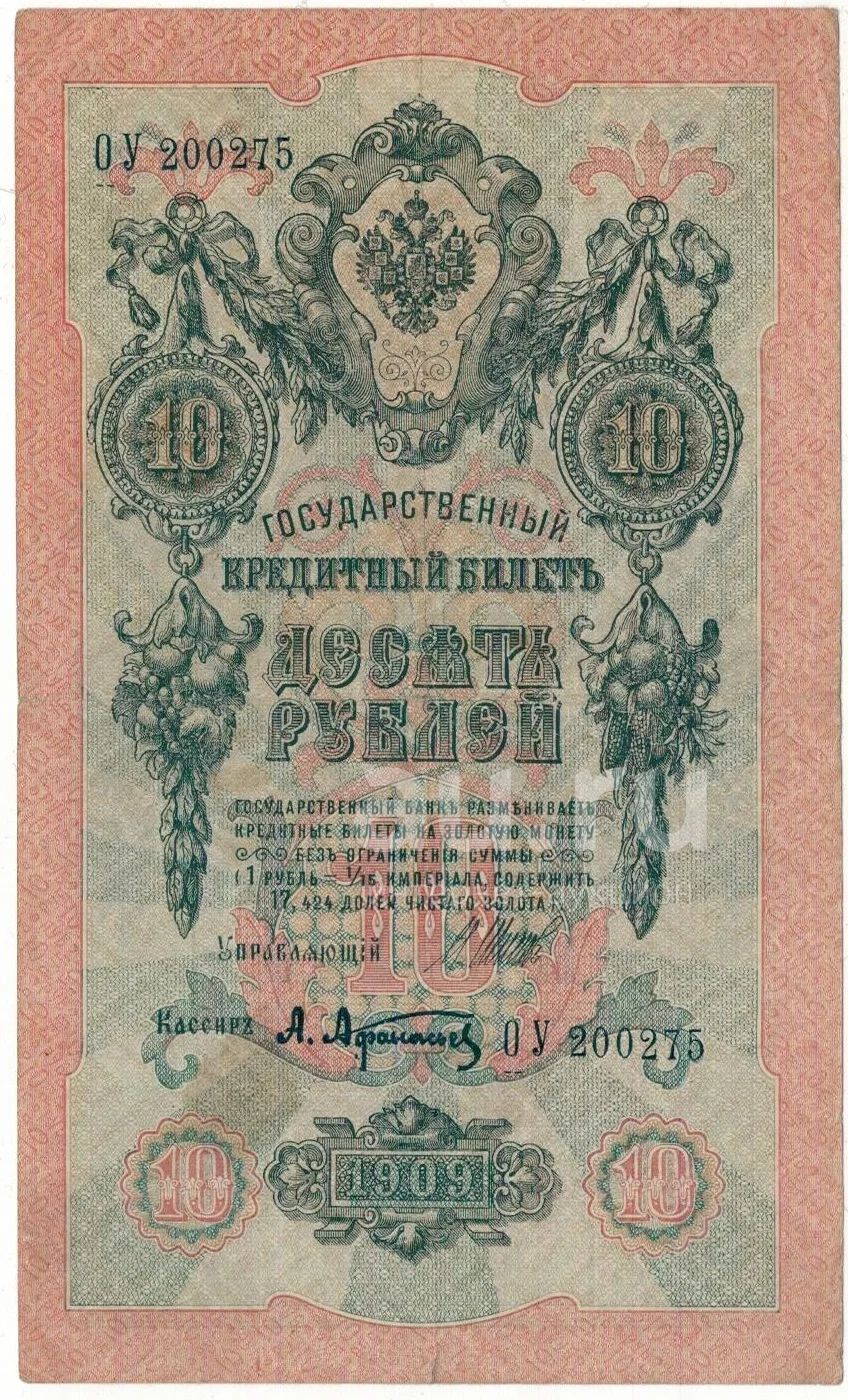 Банкнота 10 рублей 1909 И. Шипов А. Афанасьев серия ОУ 200275 хорошая бона