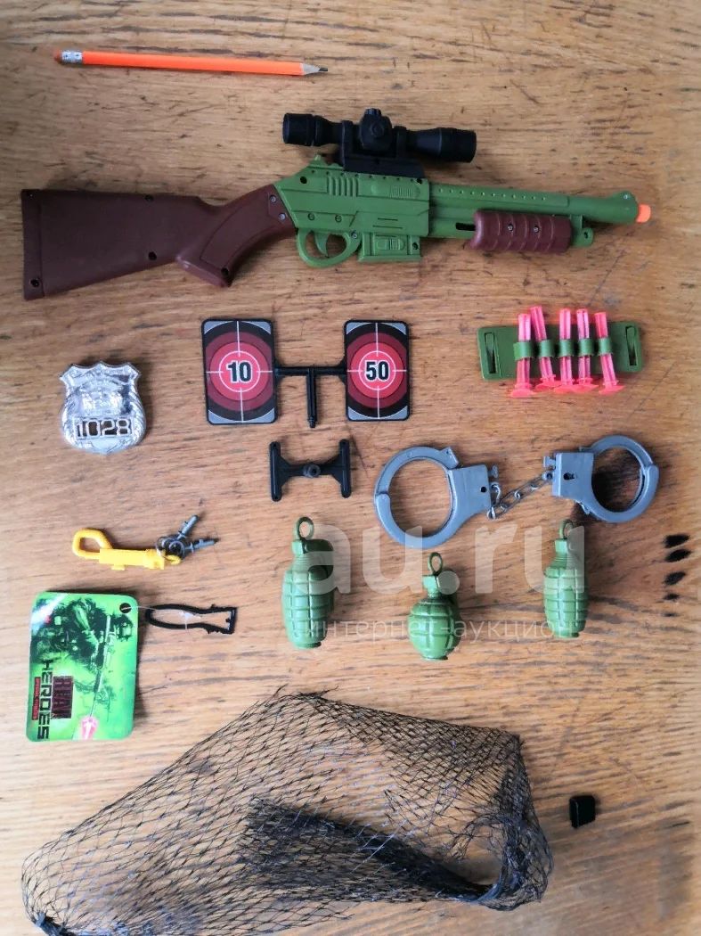 Комплектность на фото. Не пользовались. Был мешок сетка, к сожалению порвался. Карандаш для масштаба, длинна автомата 45 см.Пластик.