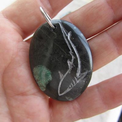 Для изготовления использованы pубы ископаемой песчаной акулы макко. В настоящее время встречается крайне редко. Найдены на побережье Морокко .Возраст находок - 40 000 000 лет.