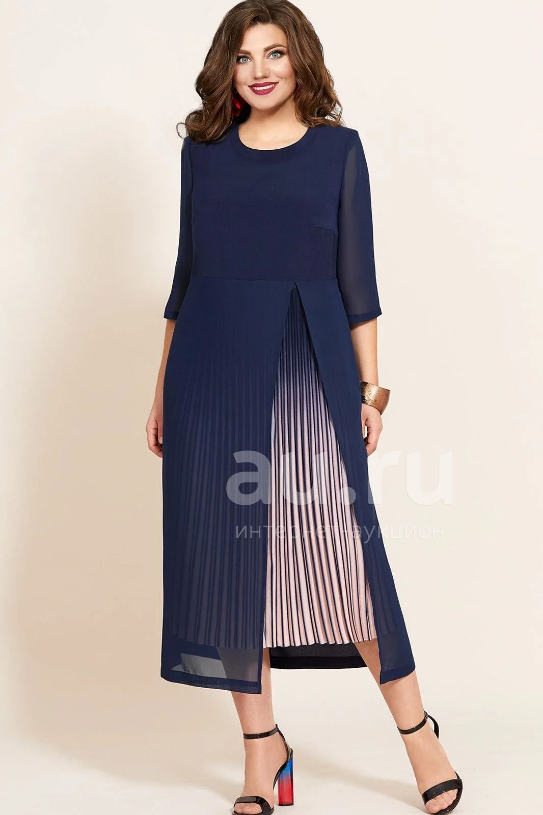 Платье женское нарядное полуприлегающего силуэта, расширенное к низу. Выполнено из креп-шифона (не тянется) в сочетании с шифоном (не тянется). Вырез горловины круглый на обтачке, рукав втачной, по спинке потайная тесьма – молния. Декором служит вставка из плиссе по переду платья. Длина платья – 123 см. Длина рукава – 44 см. Ширина рукава в пройме – 36 см.