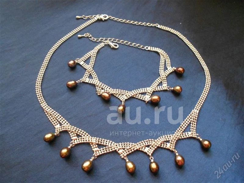 Длина регулируется. Браслет от 18 до 24см. Колье от 40 до 50см. Жемчуг хамелион - коричневый с переливами серого, сиреневого, зеленоватого - в зависимости от освещения. В наличии 1шт.