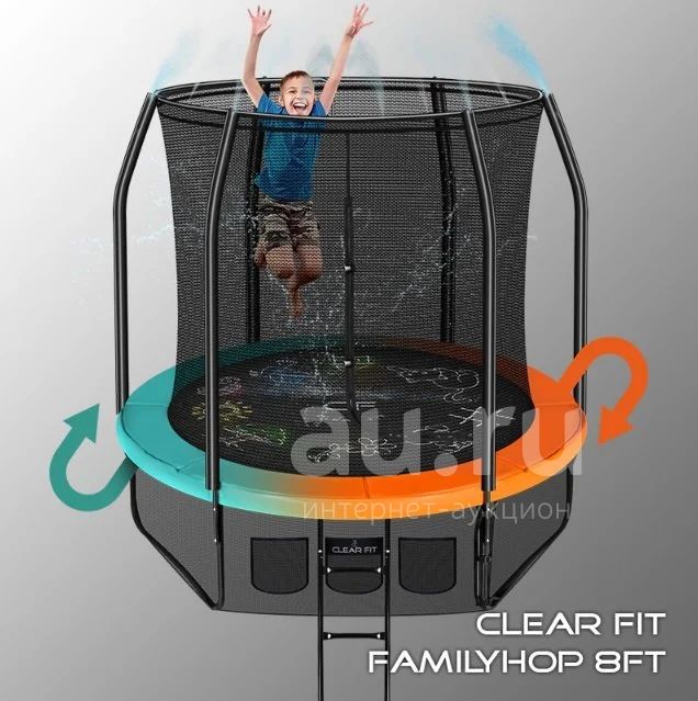 Батут Clear Fit серии FamilyHop — современная концепция семейного батута, учитывающая все пожелания, плюсы и недочеты предыдущих поколений. Основной упор сделан на качество, надежность конструкции и развлекательную составляющую. Каркас из толстостенных труб, мощные метизы, качественные пластик и материалы защиты, износостойкое всепогодное прыжковое полотно, удобное и безопасное крепление. Защитный мат – двусторонний, вы можете выбрать цвет батута при установке и менять его по настроению – ярко оранжевый или изумрудный. В комплект входит спринклер, устанавливается по периметру батута, в жаркий день можно подключить подачу воды и наслаждаться прохладными брызгами. Для малышей на полотно нанесены рисунки -можно раскрашивать цветными мелками. Батуты FamilyHop поставляются в максимальной комплектации: батут, верхняя защитная сеть, цокольная защитная сеть, лестница, спринклер. Диаметр прыжковой поверхности 2 м, батут легко разместить на небольшом участке, при этом он оптимально подойдет как для детских игр, так и для фитнесса тренировок. Верхняя защитная сеть оберегает от падений, нижняя защитная сеть исключает случайное попадание под батут во время тренировки. Усиленный каркас и порошковая окраска всех элементов рамы делает батут безопасным, устойчивым, надежным, гарантирует полную защиту от коррозии и долгий срок службы. Качественные материалы и мощная рама предусматривают эксплуатацию батута 8FT пользователями до 120 кг.