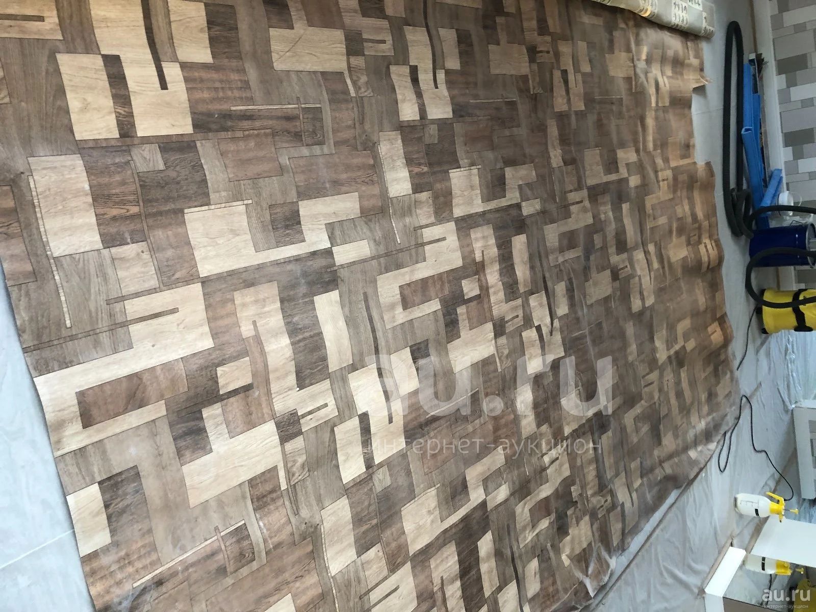Размер куска 3.80 на 3.90. Линолеум, сняли в начале ремонта после застройщика. По факту в использовании не был. В строительной пыли, в центре замят, хранился в свернутом виде. В других лотах есть другие размеры.