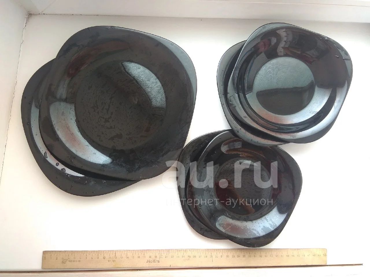 Набор из 6 стеклянных черных тарелок одним лотом. Сколов и дефектов нет.