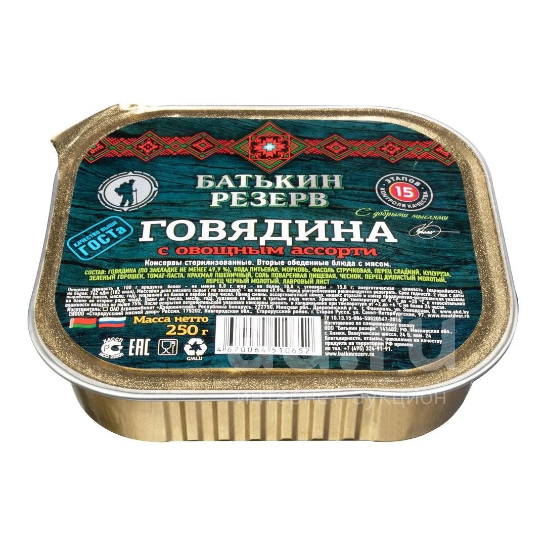 Говядина с овощным ассорти Батькин резерв 250 гр ламистр гост Состав: Говядина (по закладке не менее 49,9%), вода питьевая, морковь, фасоль стручковая, перец сладкий, кукуруза, зеленый горошек, томат-паста, крахмал пшеничный, соль поваренная пищевая, чеснок, перец душистый молотый, перец черный молотый, лавровый лист.