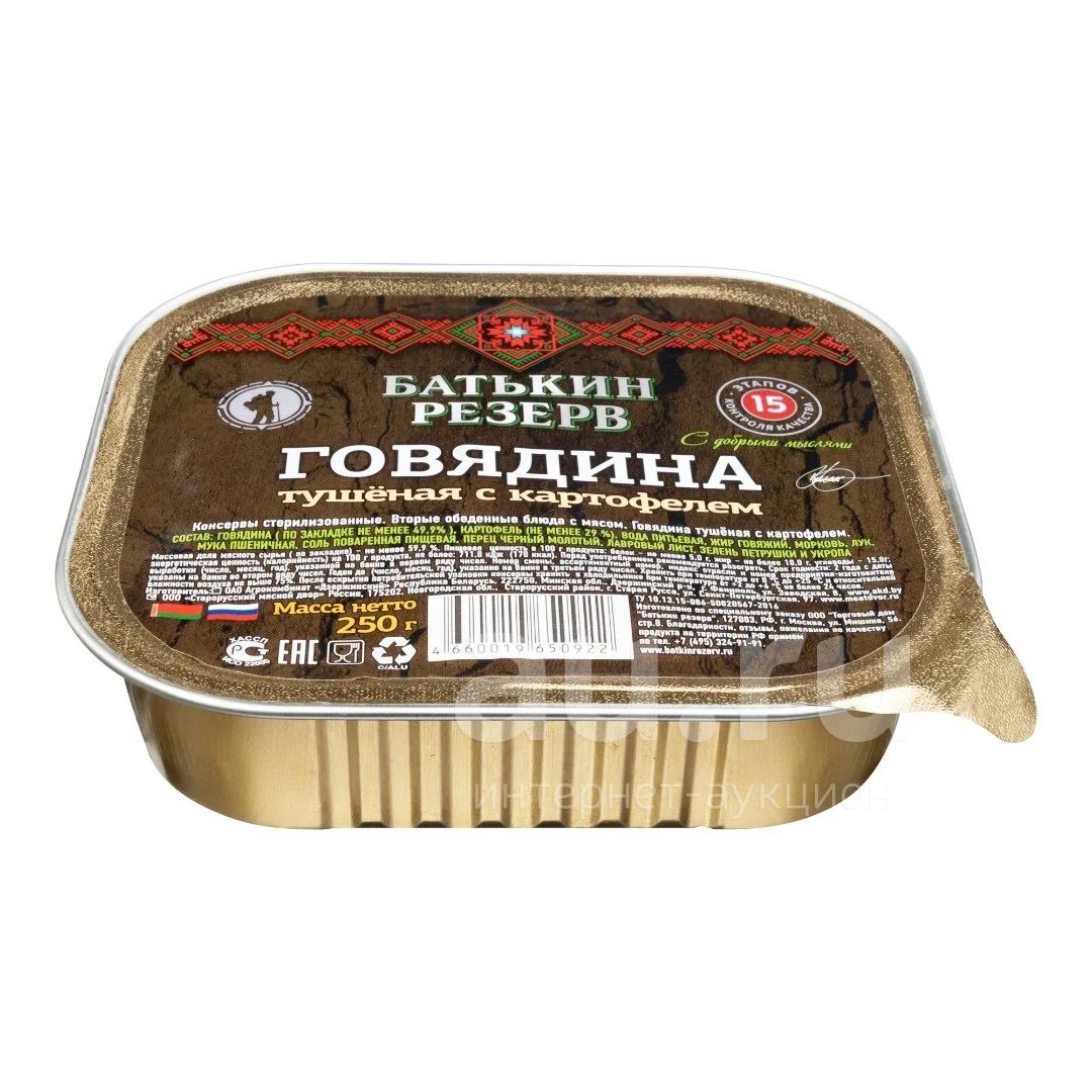 Говядина с картофелем Батькин резерв 250 гр ламистр Состав: говядина (по закладке не менее 49,9%), картофель (29%), вода питьевая, жир говяжий, морковь, лук, мука пшеничная, соль поваренная пищевая, перец черный молотый, лавровый лист, зелень петрушки и укропа