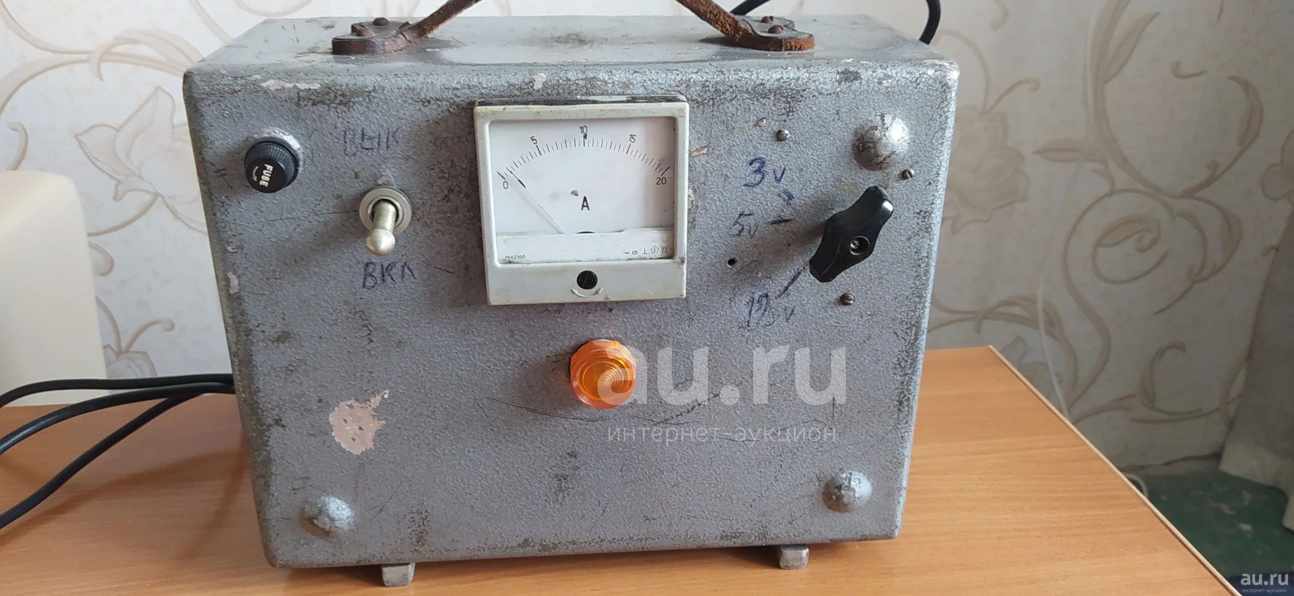 Достался ещё от деда.Обычный автомобильный аккумулятор на 12 вольт заряжает отлично!