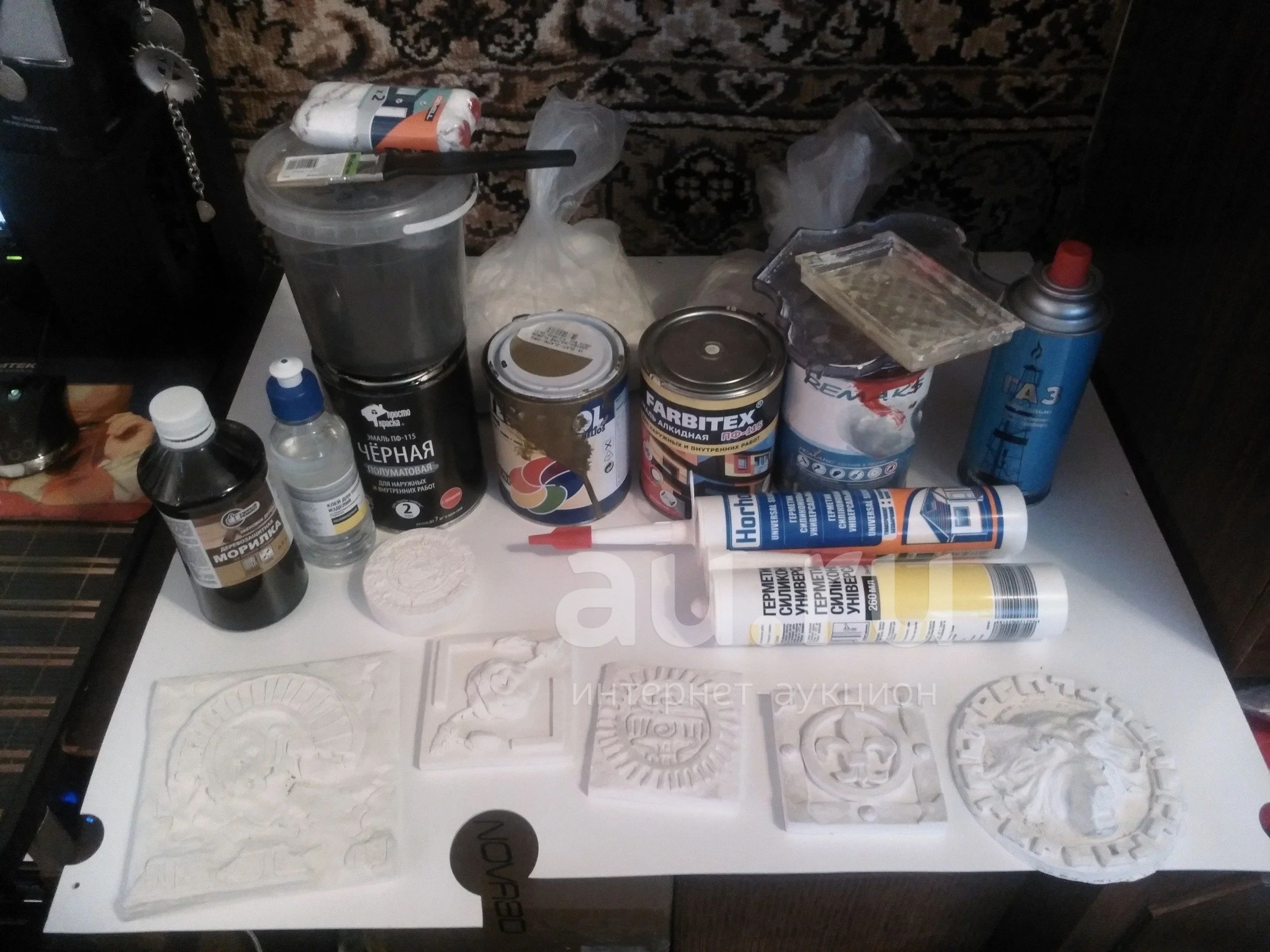 Что то почти полное!Газ,морилка,гипс особо прочный г-16 около 4кг,краски,гипсовые элементы декора,краситель для бетона(чёрный порошок)формы плитки!