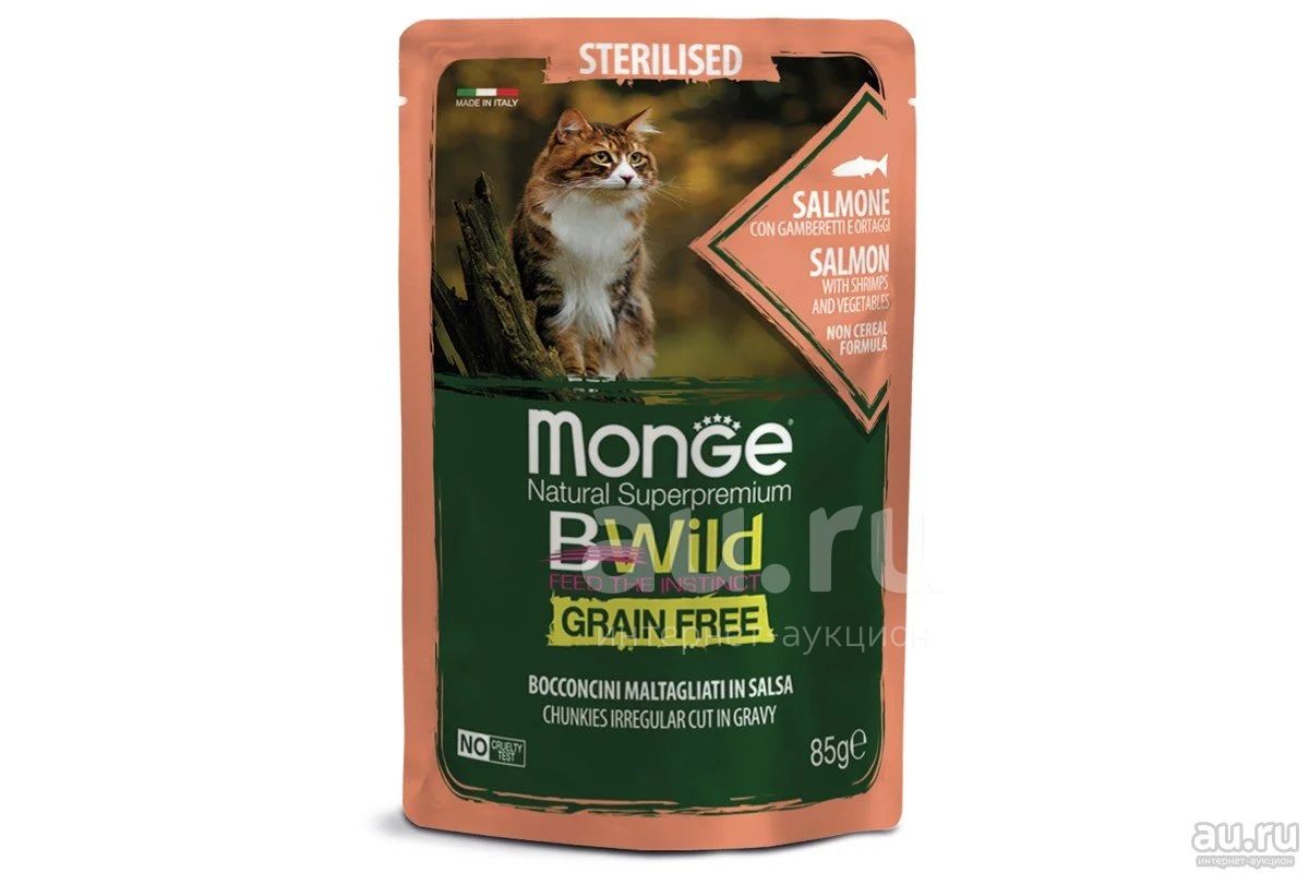 Monge Cat BWild GRAIN FREE (Монж) паучи из лосося с креветками и овощами для стерилизованных кошек 85г, шт.