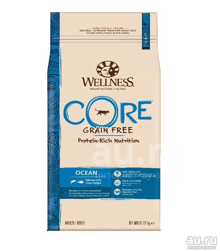 Корм создан с учётом естественных потребностей домашних кошек, которые по своей природе являются хищниками, поэтому все корма Wellness CORE беззерновые и содержат свежее мясо и рыбу на первом месте во всех рецептурах.
