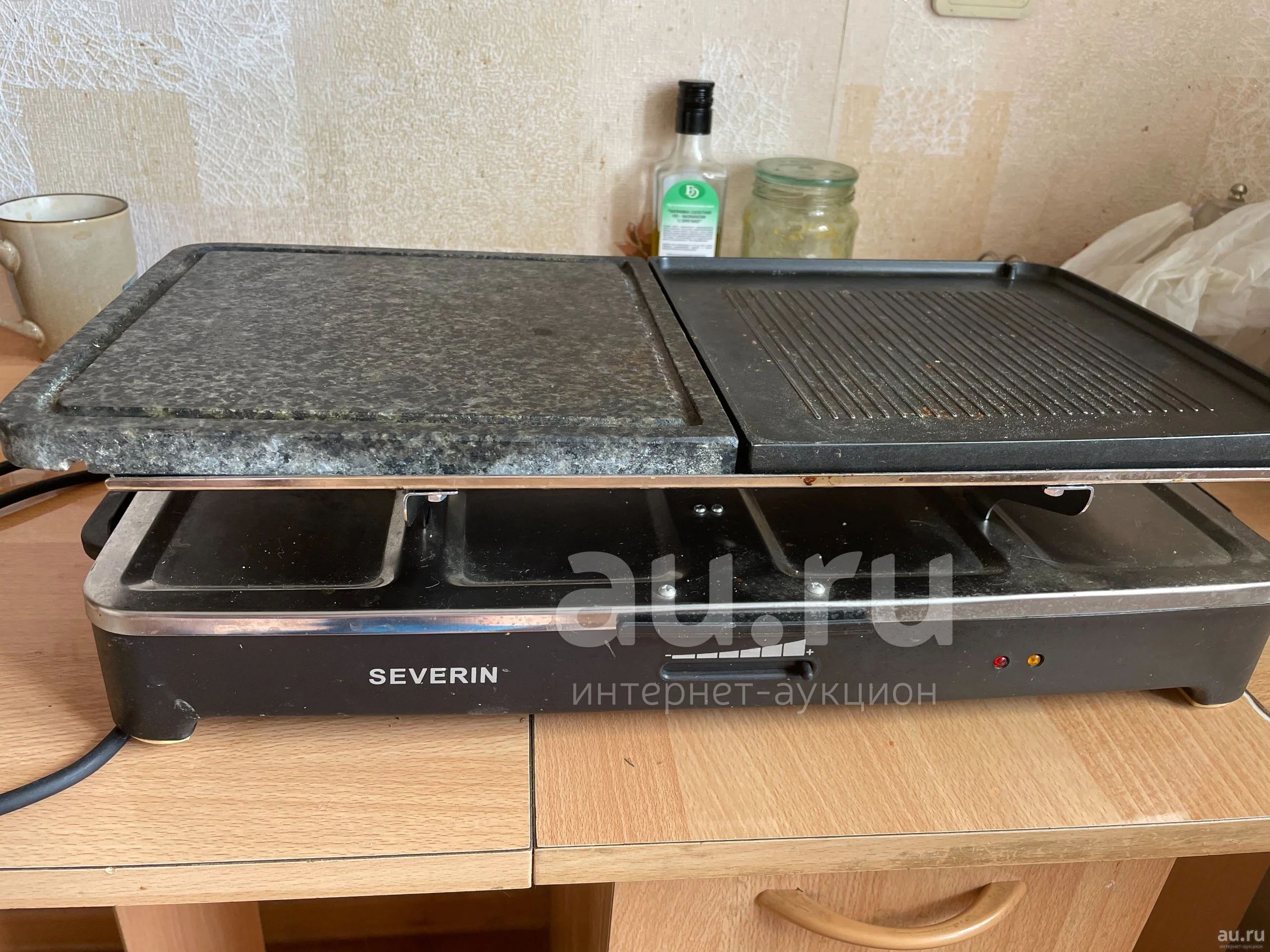 Гриль рабочий. Сковородки для раклетницы давно выброшены, так как бесполезны. Отмыть и будет как новый. Стоял на шкафу под потолком на кухне, соответственно испачкался за несколько лет простоя.