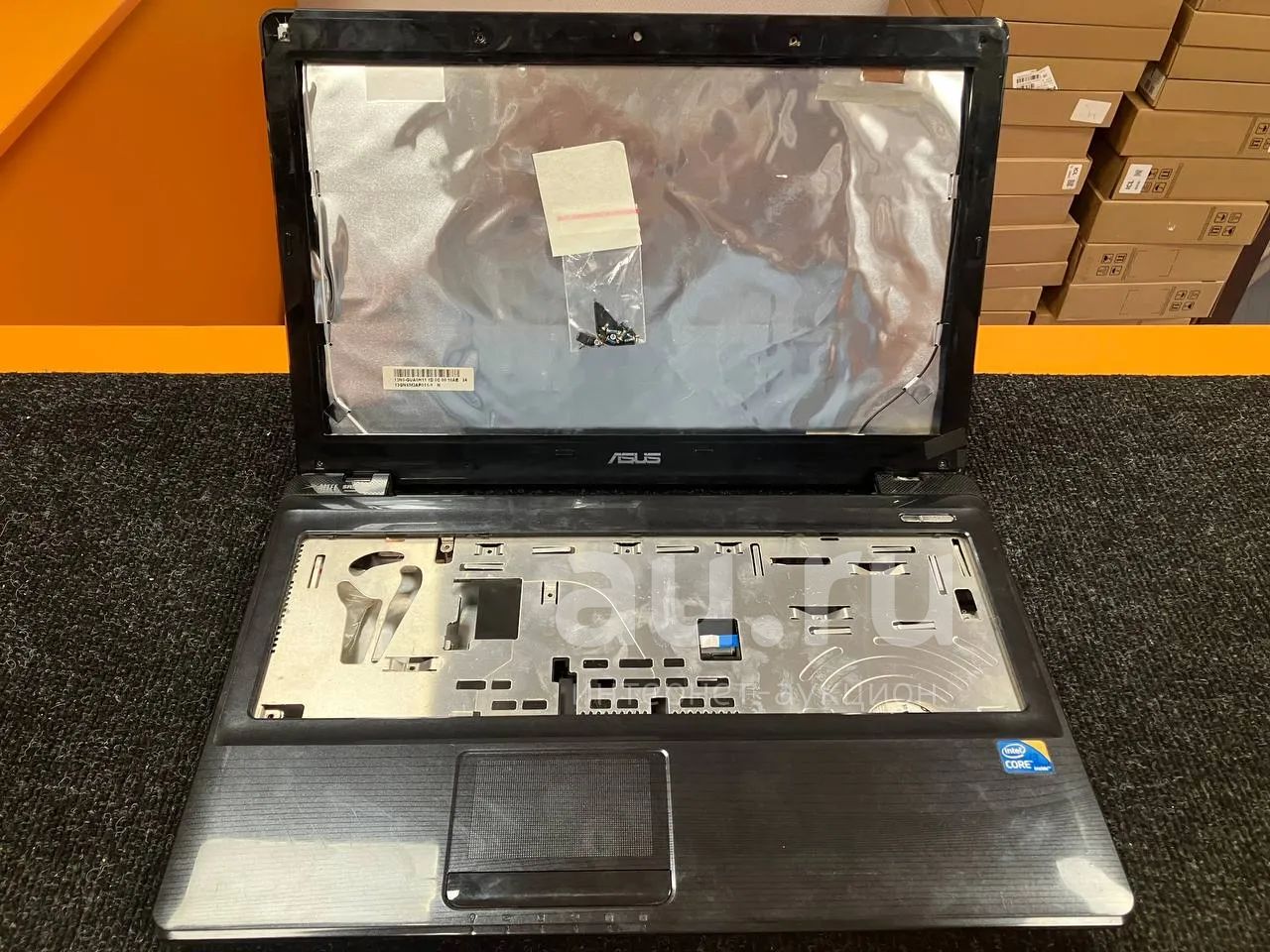 Б/У корпус в сборе, крышка матрицы с треснутой рамкой, дно, петли, тачпад, динамики, топкейс для ноутбука Asus K52 K52D A52 A52D A52J K52N K52J X52 X52A X52J. Вырваны гайки! №2