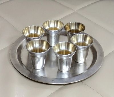 Набор коньячный Березка, мельхиор, позолота СССР . 6 рюмок + поднос.