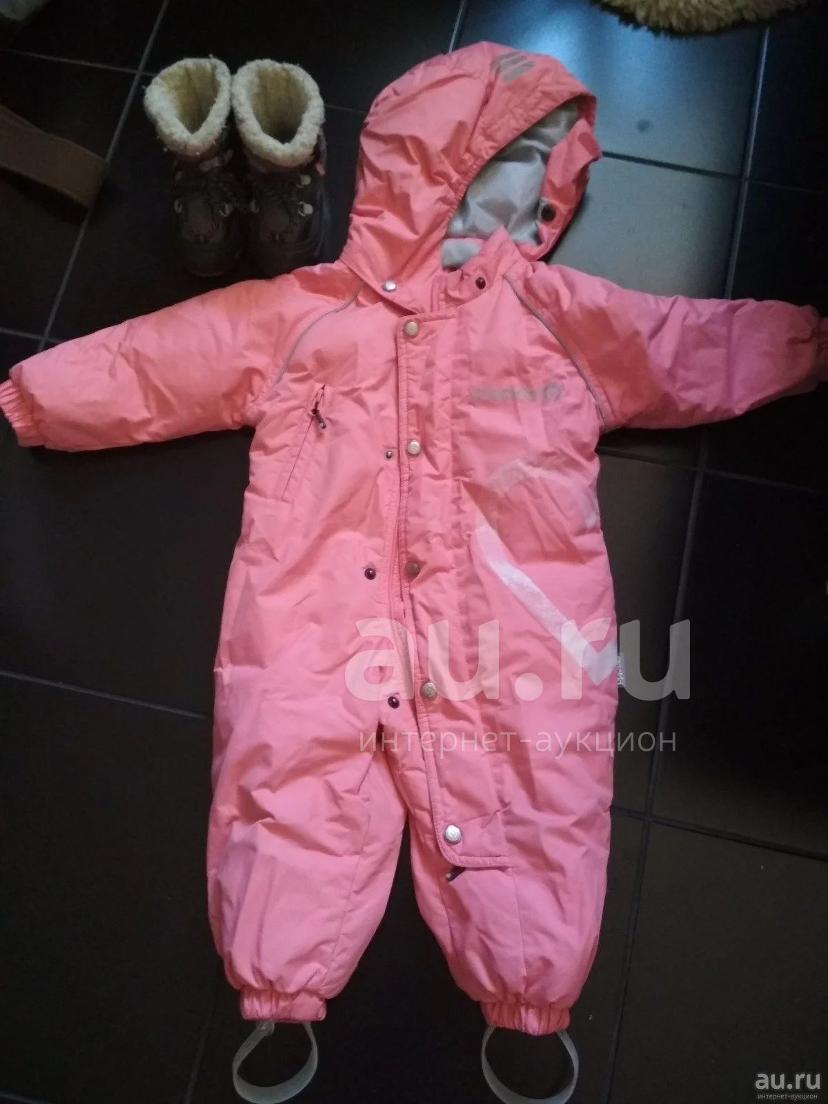 Качественный пуховый комбинезон Крокид 74-80, тёплый, удобный, лёгкий. Немного стёрлось сердечко. Цвет лососевый. Отдам с сапожками Демар.