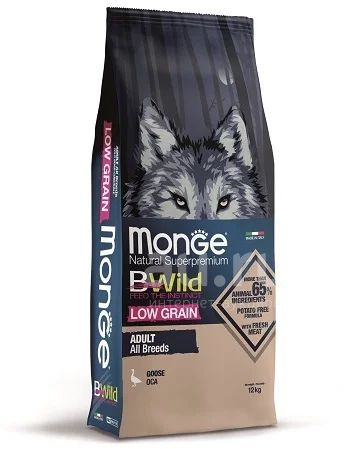 Monge (Монж/Монже) Dog BWild LOW GRAIN низкозерновой (холистик) корм из мяса гуся для взрослых собак всех пород 12 кг- полноценный сбалансированный рацион из мяса гуся для взрослых собак всех пород. Рацион разработан с высоким содержанием легкоусвояемого белка и с ограниченным количеством злаков и не содержит картофеля. Оптимальный баланс Омега-3 и Омега-6 в составе корма чрезвычайно важен для поддержания красоты шерсти и здоровья кожи. Лесные ягоды и травы - источники питательных веществ, натуральной клетчатки и биологически активных компонентов. Наличие в рационе овощей и ягод увеличивает вкусовую привлекательность корма. Формула содержит Х.О.S., что помогает сохранить естественный баланс кишечной микрофлоры и способствует оптимальному усвоению питательных веществ.